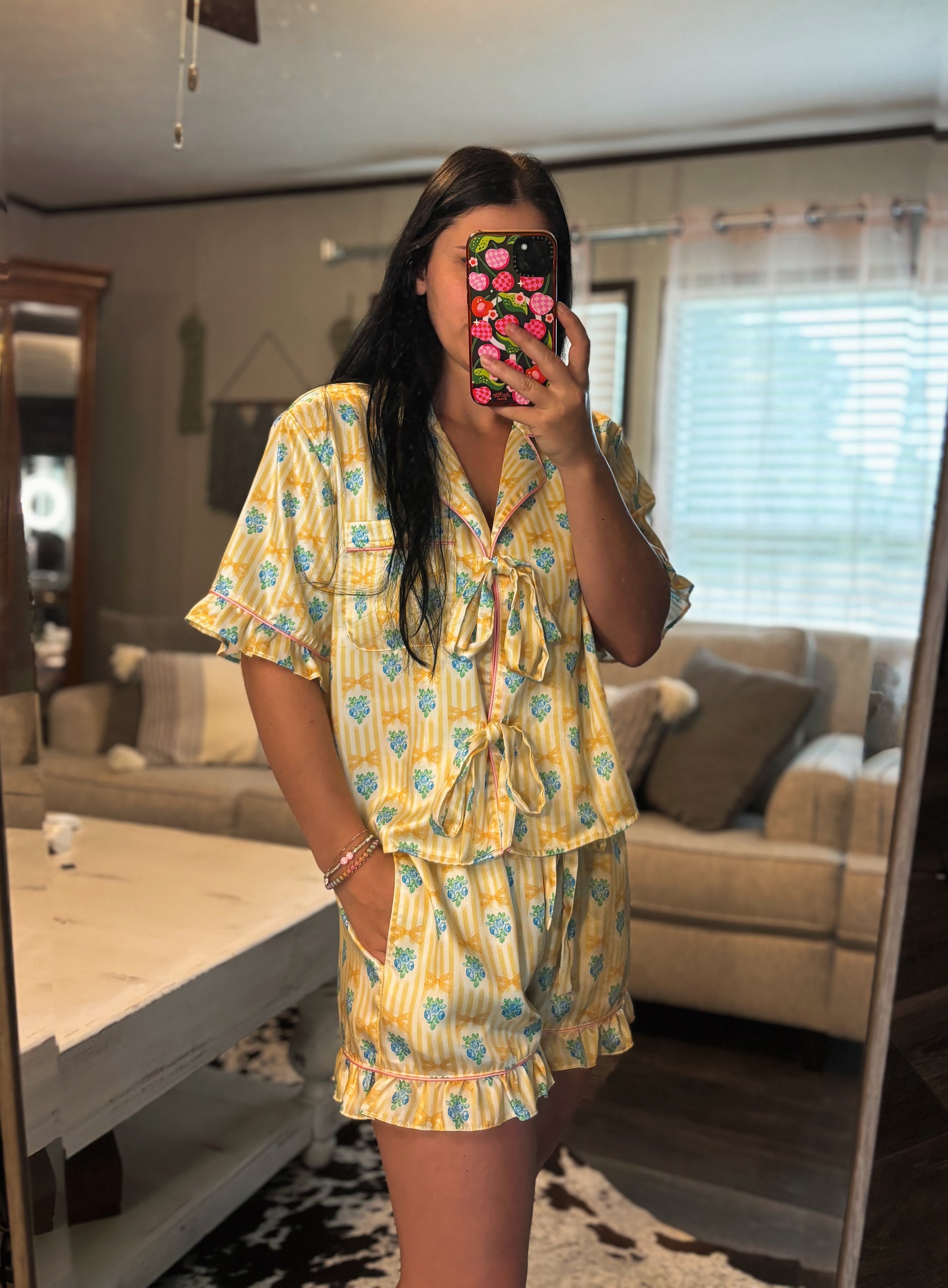 The silkiest set! You will not want to take it off because it feels that good! This is a set which includes the top and shorts.