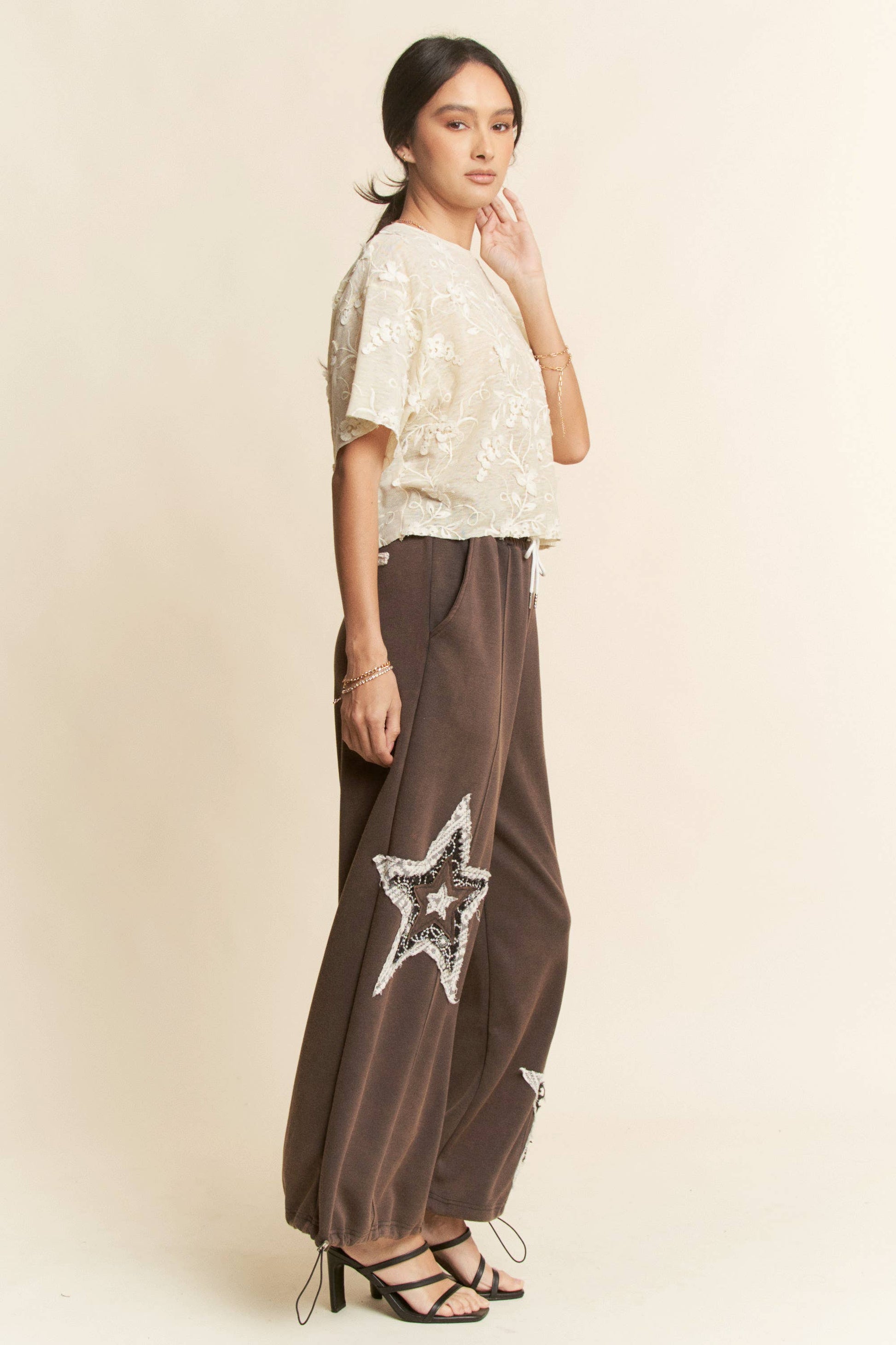 LIGHT WEIGHT DENIM STAR PATCHWORK ADJUSTABLE BOTTOM ELASTIC WAISTBAND PANTS