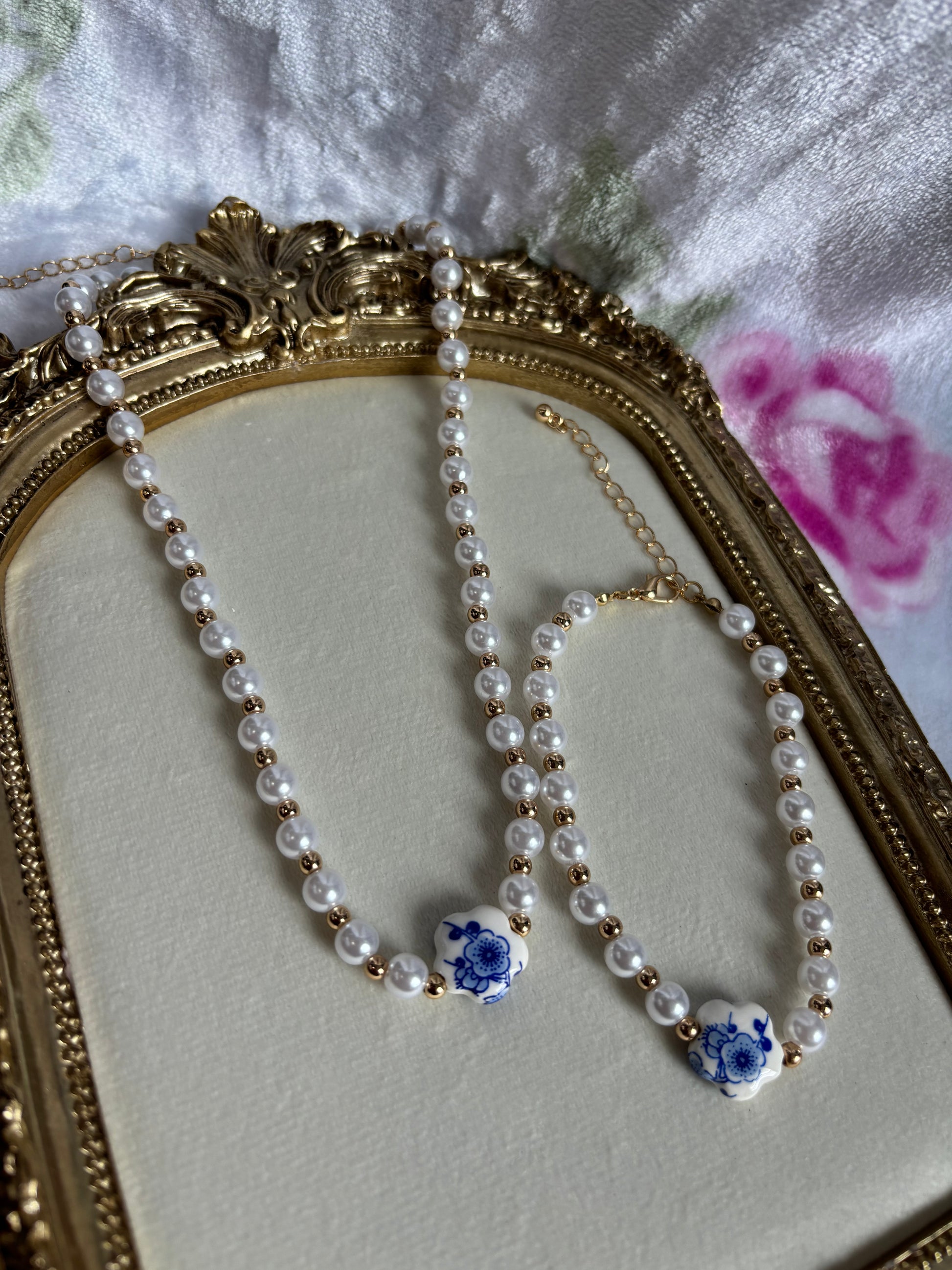 Pearl and antique blue flower set. Necklace and matching bracelet