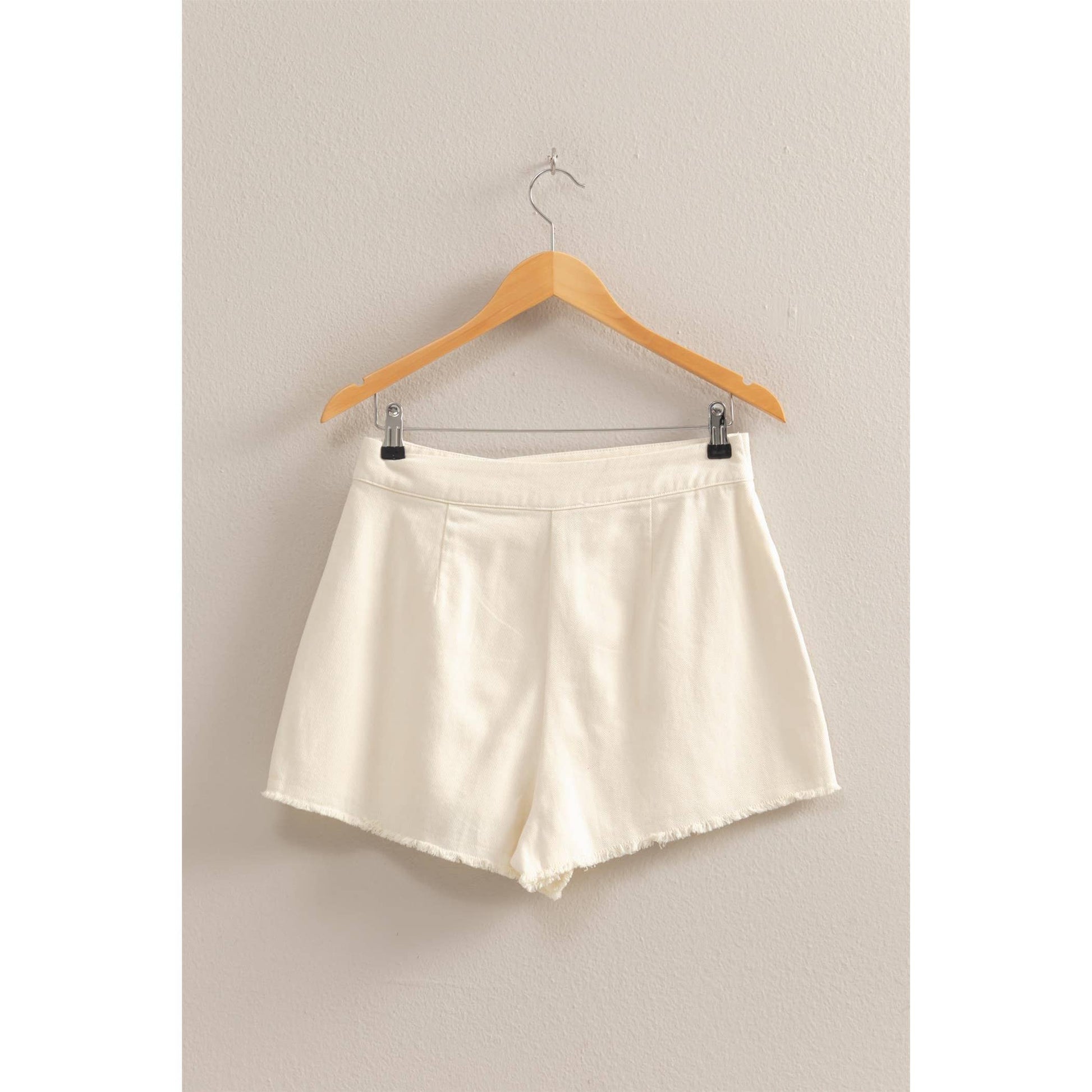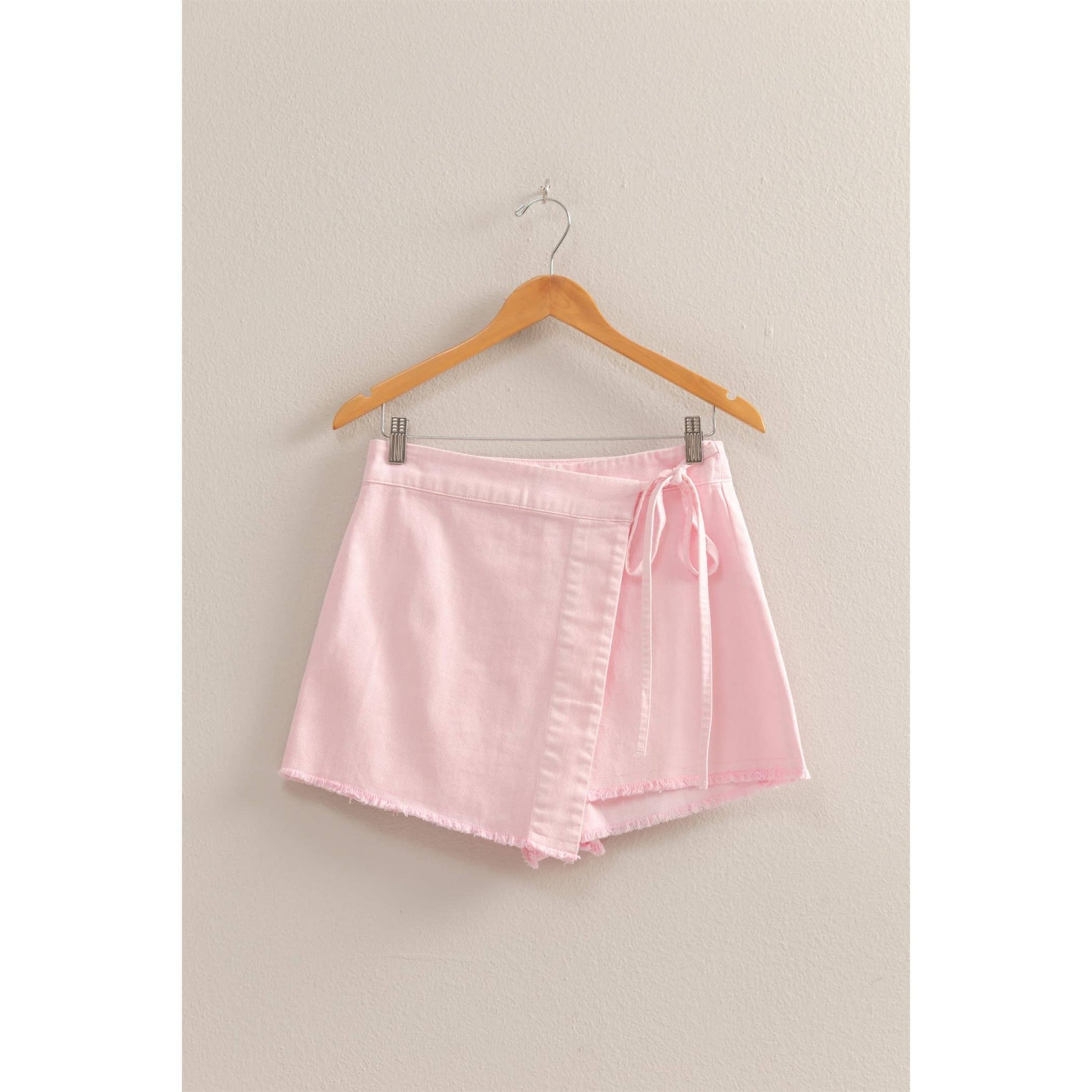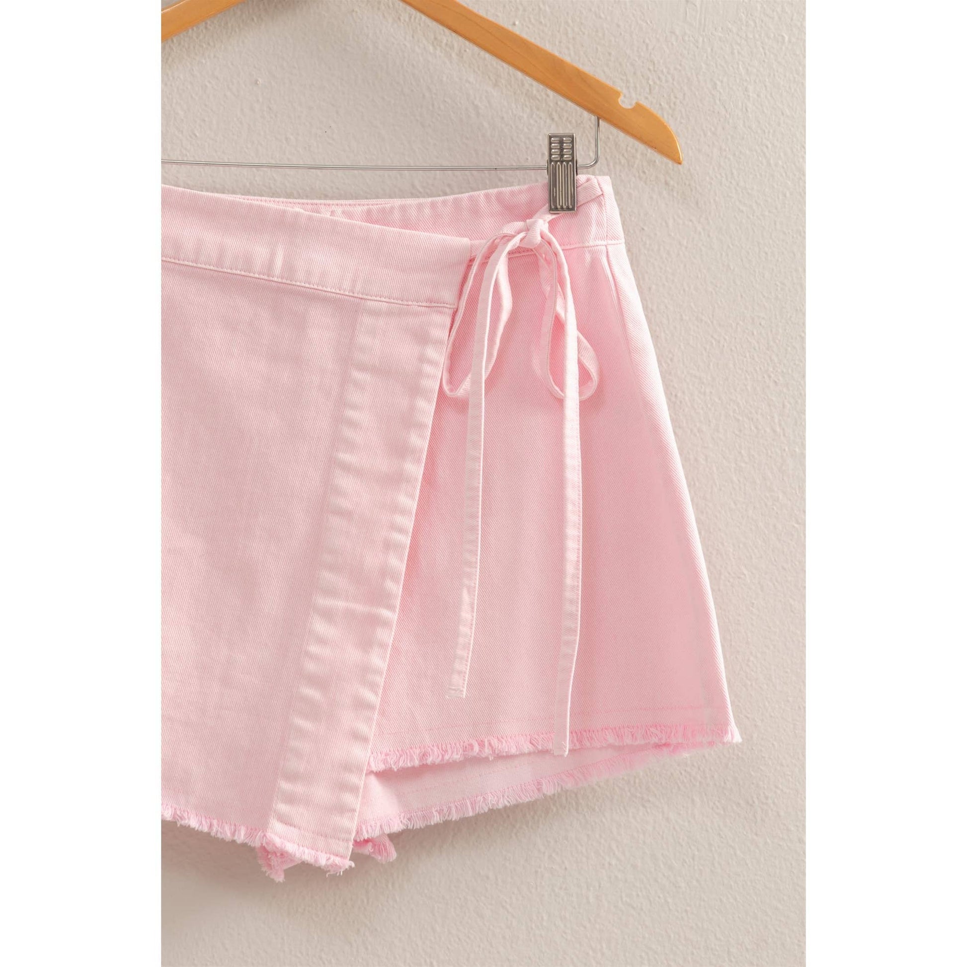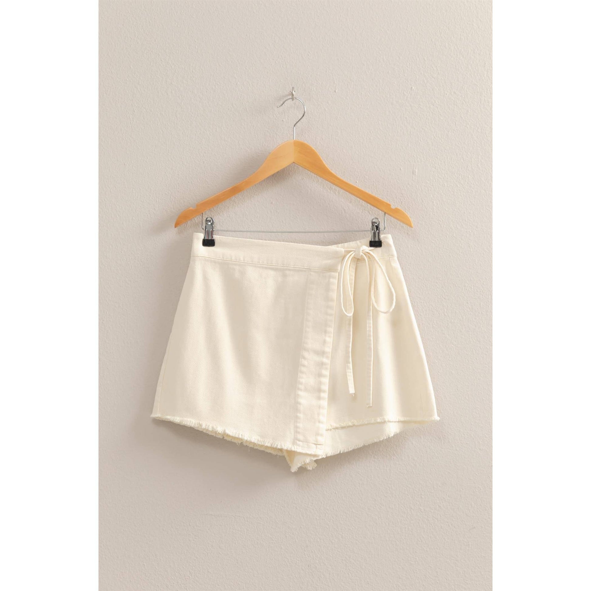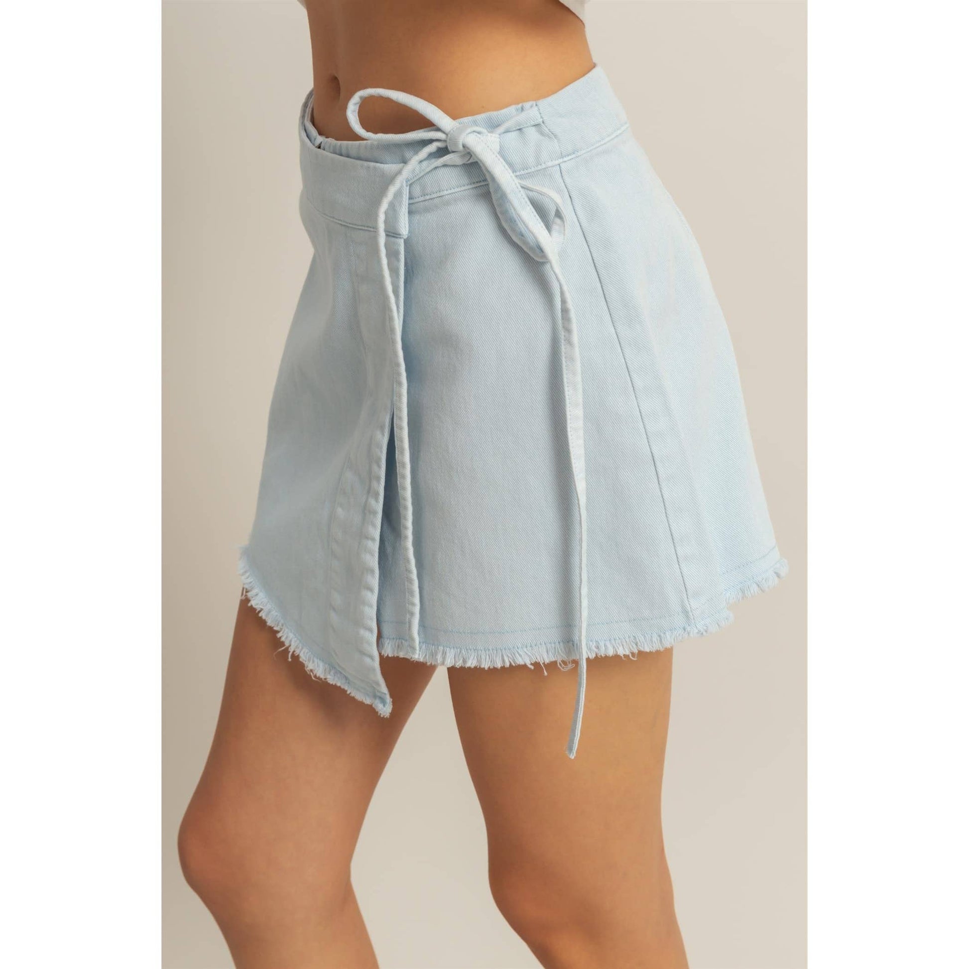 A High-Waist Cut Comes With Self-Tie Straps Along The Waist, That Can Be Secured Into A Cute Bow. The Skort Has A Relaxed Fit With A Frayed Hem And Attached Shorts Underneath.
