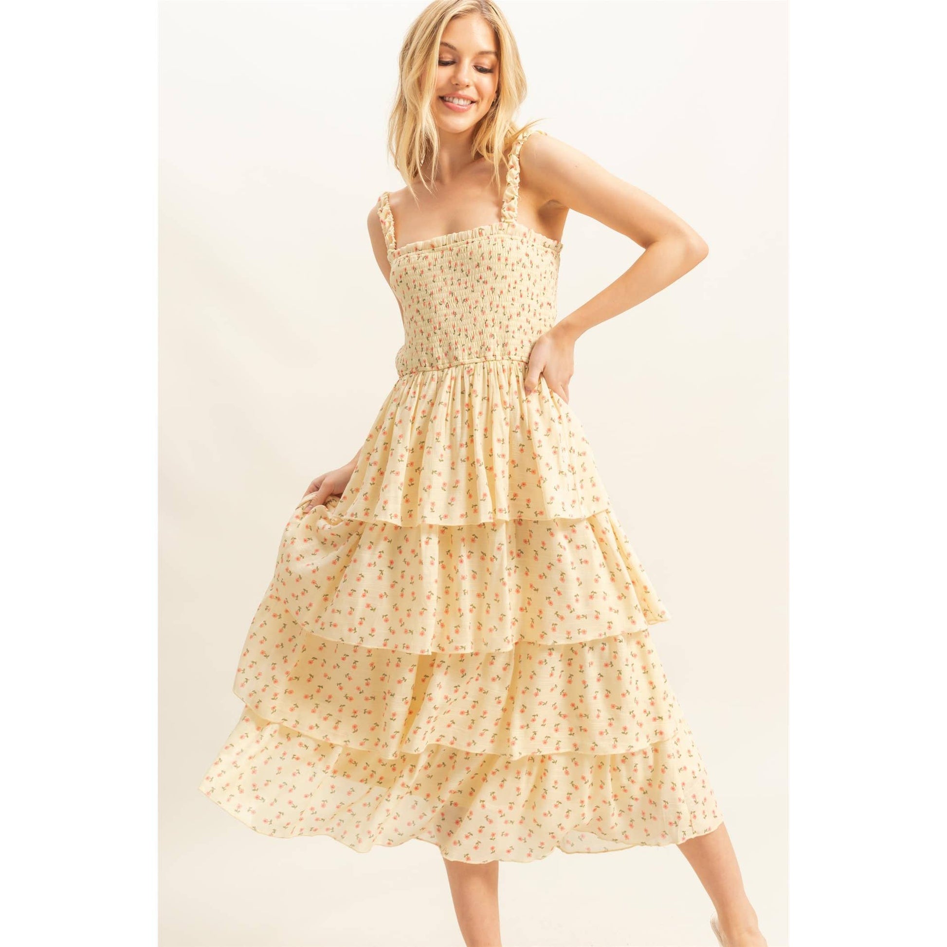 Decorated With A Ditsy Floral Print, This Dress Shapes A Straight Neckline With Shoulder Straps. Smocked Detailing Along The Bodice Falls Into A Tiered Skirt With A Flowy Midi Hem.