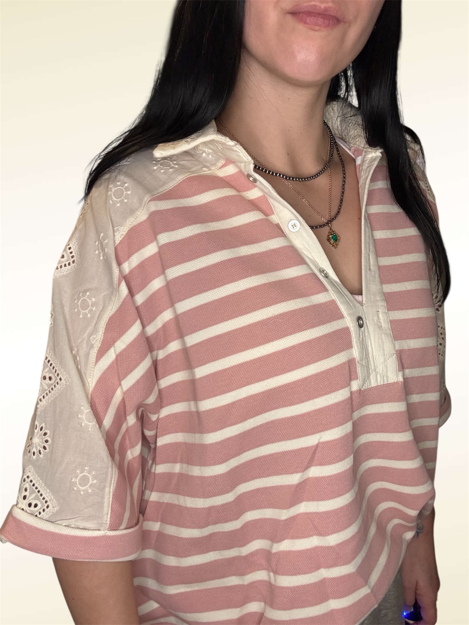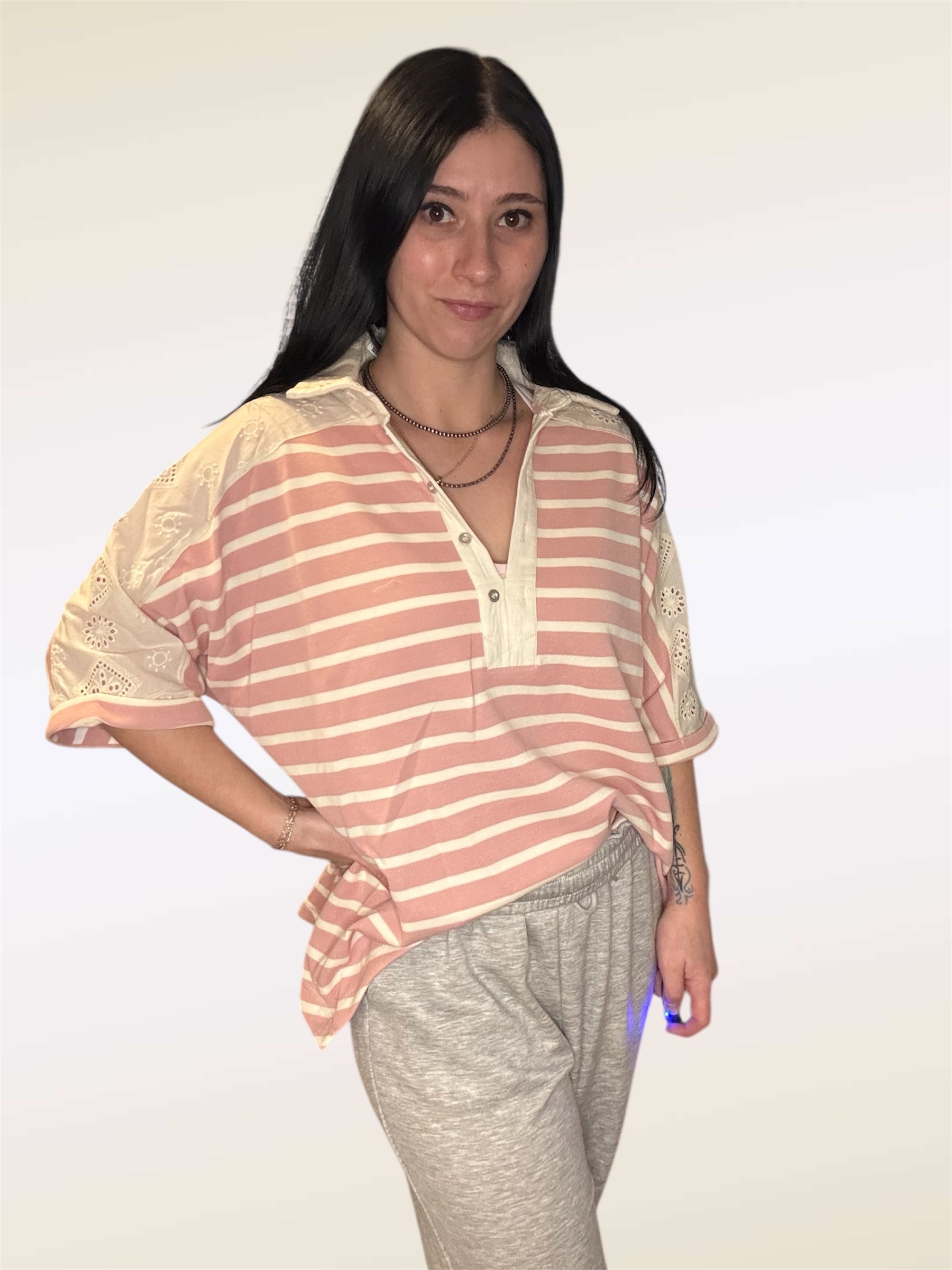 Oversized top with lace detailing on shoulders. Perfect for leggings or tucked in jeans. Sizing is very oversized