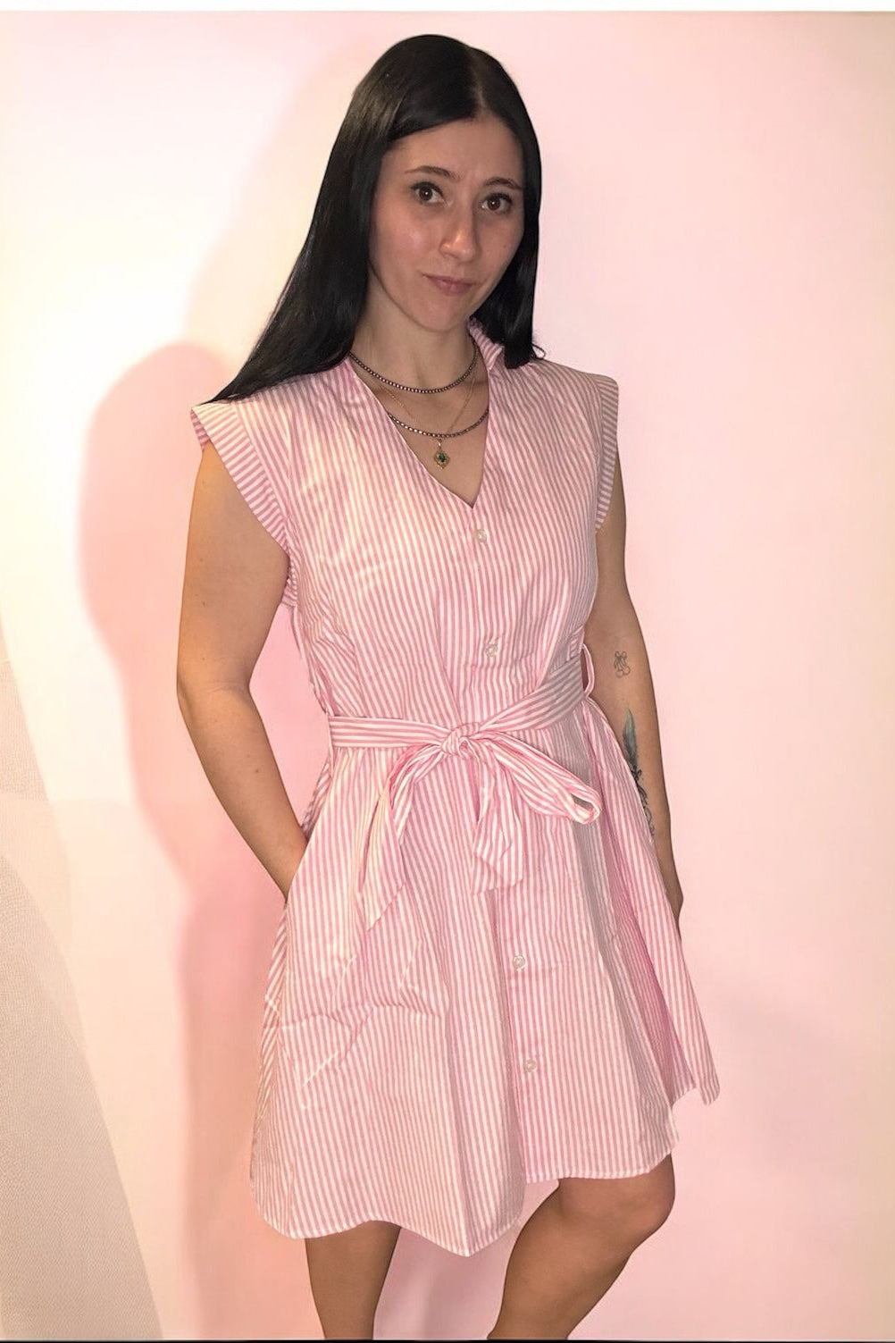 Light and comfortable pink stripe dress with removable belt. Fit is generous/flowy.