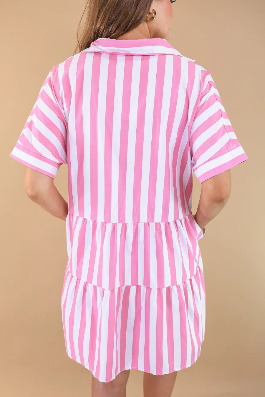 Get ready to radiate sunny vibes with our Sunny Days Ahead dress in pink! This playful striped tiered dress features fun faux buttons and is perfect for any occasion. Bring on the sunshine and charm in this piece.